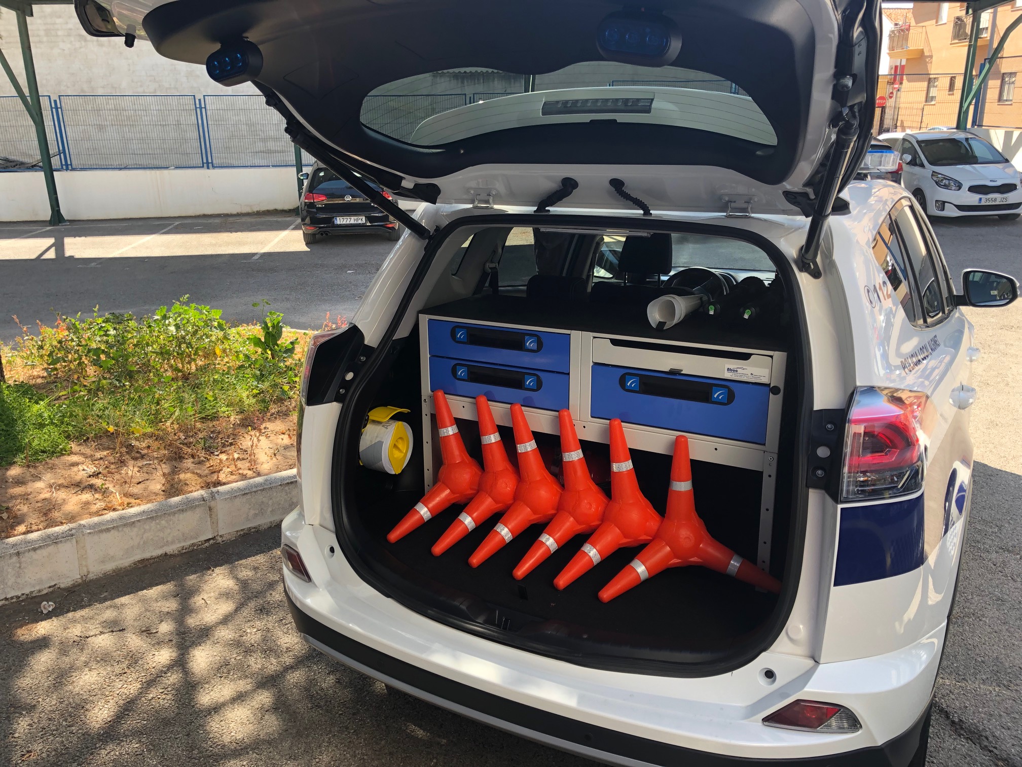 Destacar del equipamiento policial de Alginet la gran utilidad que aporta el mueble a este tipo de vehículos, teniendo este 3 cajoneras de gran capacidad, así como una bandeja extraible que puede utilizarse como mesa de escritura.